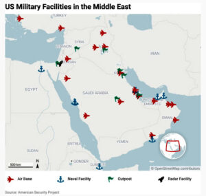 عرب میڈیا رپورٹس کے مطابق ایران نے قطر، بحرین، متحدہ عرب امارات، کویت اور سعودی عرب میں امریکی فوجی اڈوں کو نشانہ بنایا۔